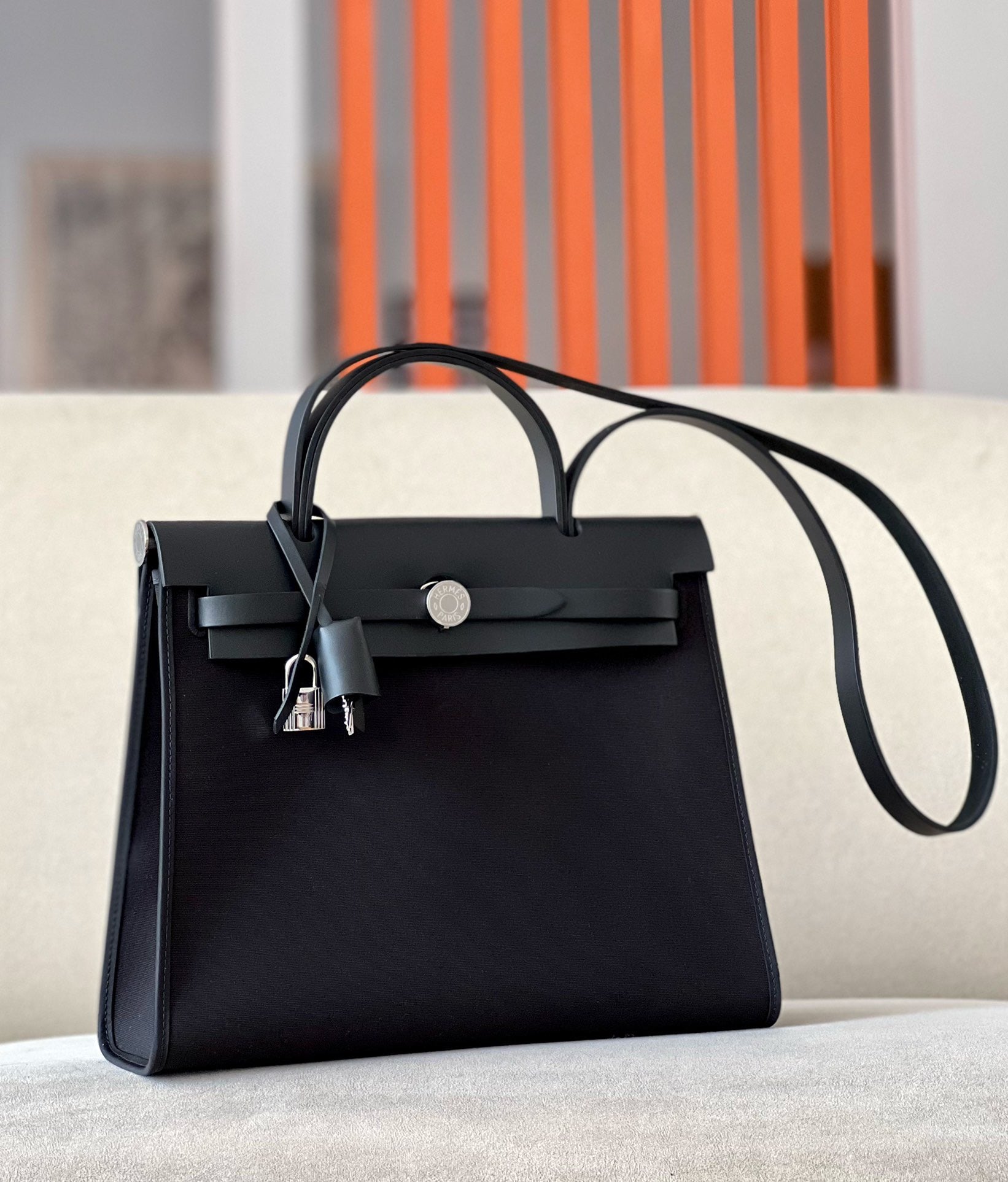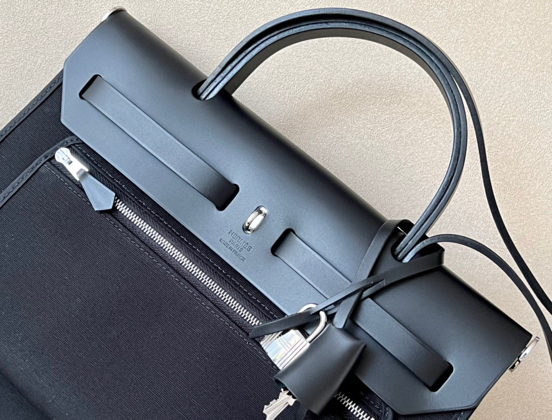 Hermes Herbag Reißverschlusstasche aus schwarzem Canvas, 31 cm