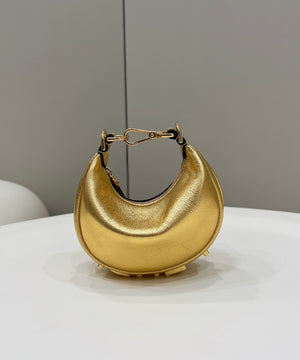 Mini hobo bag made of soft, light blue leather, embellished with vintage gold metal FENDI lettering.